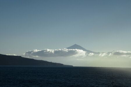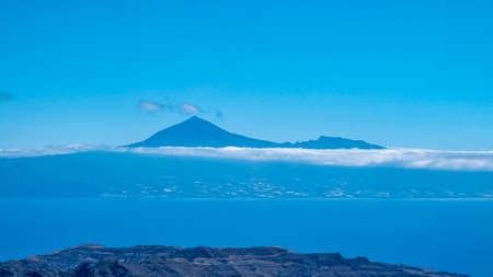 Scenic view on cloud covered volcano mountain peak Pico del Teide on Tenerife seen from Mirador Morro de Agando, La Gomera, Canary Islands, Spain, Europe. Lookout near Roque de Agando. Atlantic Ocean