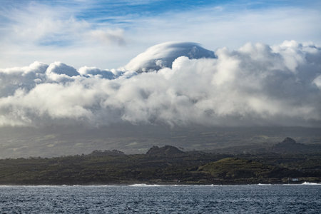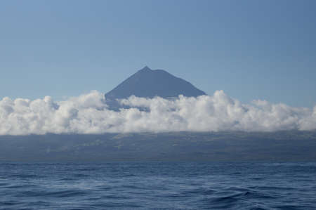 Mount Pico volcano western slope viewed from ocean with summit in clouds, seen from Faial Island in Azores, Portugal.