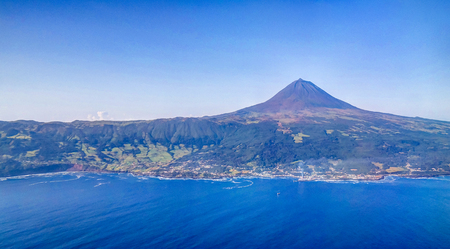 Areal view of the peak of the Pico volcano from the island of Pico in the Azores