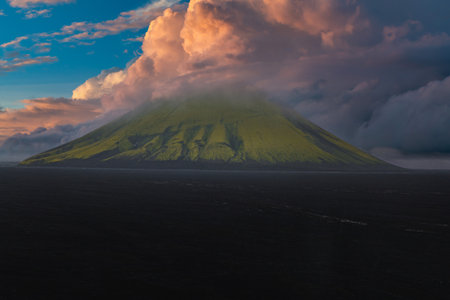 Aerial View of Volcanic Island with Moss Covered Slopes