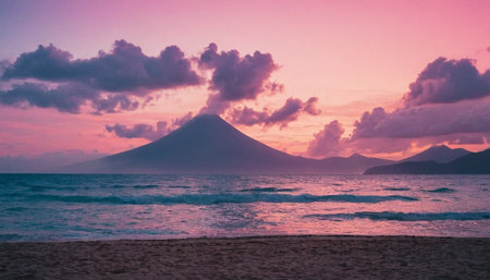 a stunning tropical seascape at sunset, capturing the essence of a tropical island paradise. this photo, inspired by the style of sacha goldberger, showcases smooth curves and a mesmerizing blend of dark cyan and light brown hues. with a low depth of field and the use of vray, the image brings to life mystical creatures and landscapes, as if taken from a dream. ai generated