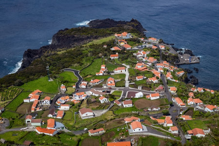Bright houses on the cliff at Atlantic ocean coast in Azores islands Portugal