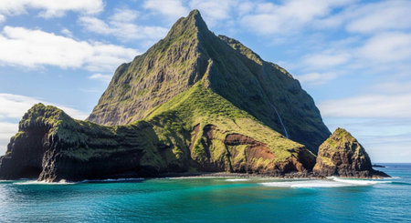 An aerial view captures a vibrant green island rising from tranquil waters. The imposing mountain range dominates the composition, while the surrounding sea reflects the overcast sky. The image uses dramatic lighting, creating a sense of scale and visual depth. Suitable for editorial and commercial applications.