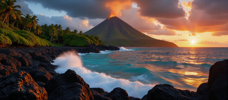 Paradise Island showcases a volcanic landscape with explosive lava meets turquoise waters amidst lush tropical flora under a dramatic sunset sky