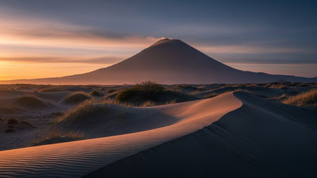 A serene desert landscape with a majestic mountain at sunset