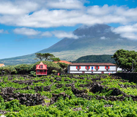 Image of mountain pico with houses and vineyard on the island of pico azores