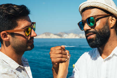 Portrait of two stylish bearded men in sunglasses posing against ocean and cityscape