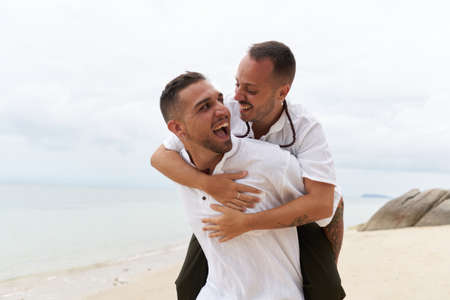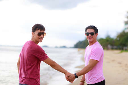 gay couple in love happy to be together. they hold hands and smile they are happy to do something together, walk, cook, work