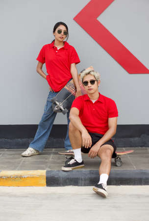 Asian couple resting after skateboarding. A young woman in a red T-shirt with collar holding the surfskates board while her boyfriend with sunglass sit in front.