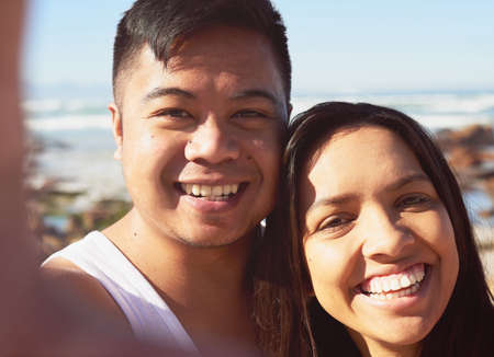 Selfies by the seaside. Selfie of a happy young couple by the sea together.
