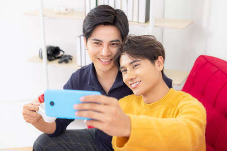 Asian teen gay men couple cuddling under the comfy blanket and watching something on smartphone screen together in the bedroom. LGBT gay boyfriends concept.