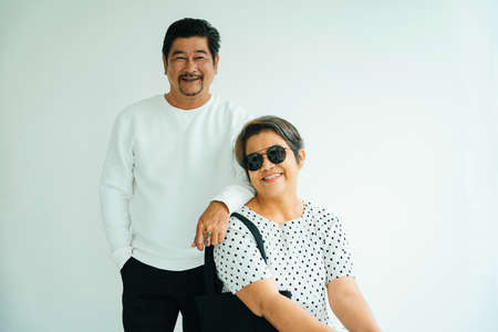 Portrait of cool old elderly senior couple in white shirt isolate on background.