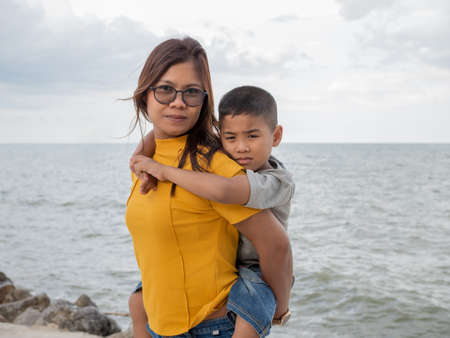 Happy elderly asian woman and break and son relax after workout at the beach in the morning
