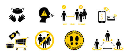 Safe shopping. Social distancing. Included icons as a mask and gloves required, clean shopping cart, avoid crowded, keep your distance and contactless payment. Keeping a distance between people.Vector