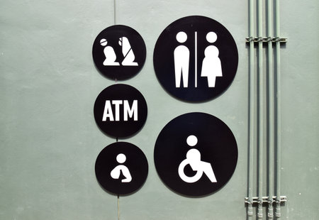 Signs on the wall for guide people to the toilet, bank and prayer room.
