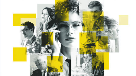 A striking arrangement of portraits showcases diverse expressions against urban backdrops.