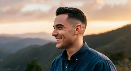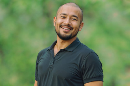 A smiling young man portrait, radiating joy and confidence in an outdoor setting