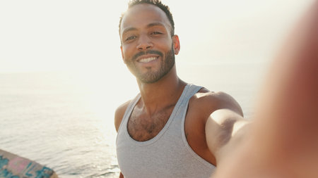 Close up, young bearded male fit athlete uses cell phone, takes selfie while resting after training on the embankment
