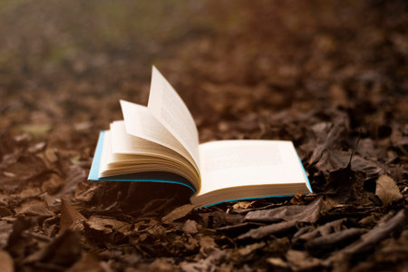 Open book with pages flipping in the wind. Reading on the lake wooden dock on autumn day. Learning enjoying tranquility of nature. Peaceful outdoor environment. Selective focus. Blurred background.
