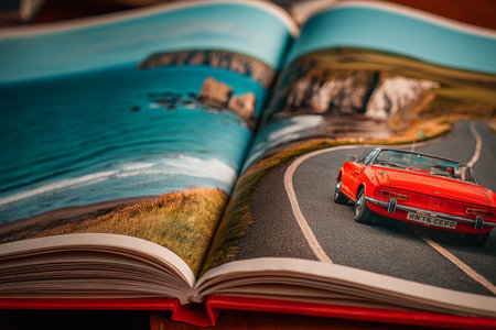 A beautifully crafted photo album lies open on a clean white surface, showcasing a stunning coastal landscape from a past adventure.
