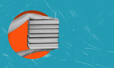 Contemporary art collage featuring a stack of books in hand. The concept of education and learning.