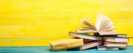 Open book, hardback books on bright colorful background.