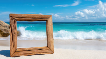 Tropical beach scene with wooden frame in foreground and turquoise waves rolling in