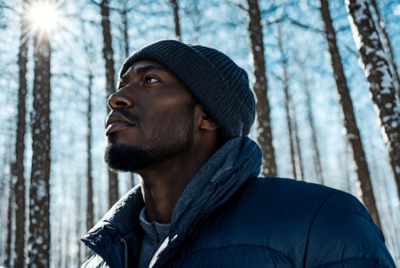 Handsome african american man in the winter forest.