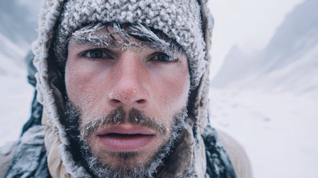 A frostbitten face with ice crystals, hinting at severe cold conditions