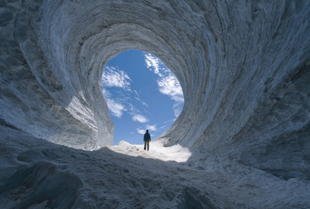 A person stands within an ice cave, silhouetted against a bright, cloudy sky. The cavern features swirling textures and cool color tones. The image, with its dramatic lighting and composition, suggests themes of exploration and discovery. Suitable for various commercial and editorial applications.