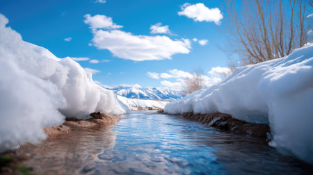 Serene mountain stream flows gently through a snow-covered landscape, reflecting the vibrant blue sky and fluffy white clouds, showcasing stunning winter beauty.