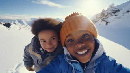 Happy african american mother and daughter looking at camera in winter mountains
