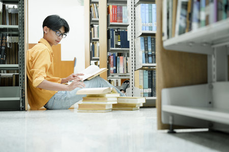 Young man sitting on the floor in an old public library and reading books. Learning the concept. Student will take up self-education in the library.
