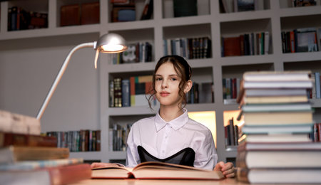 Power of imagination. Light goes from the ook. Female student is in library that full of books. Conception of education.