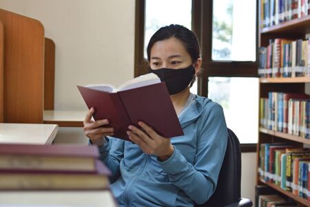 Young Asian female student reading book in library for studying, knowledge and literature research.