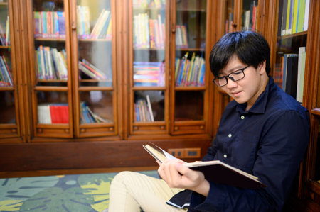 Smart Asian man university student wearing glasses reading book by vintage bookshelf. Textbook resources in college library for educational subject and research. Scholarship for education opportunity.