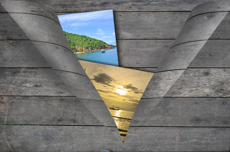 Travel photo collage on wooden background