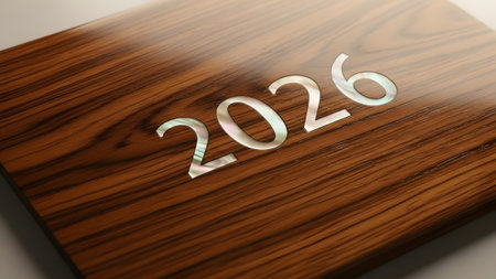 Close up of the year 2026 inlaid in mother of pearl on a polished wood surface. Clear details and...