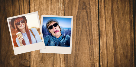 some old photos on the brown wooden table background