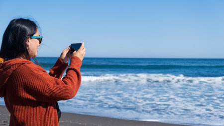 Hispanic woman taking picture at sea. Beautiful curly hair lady photographing nature ocean. Smiling ethnic girl holding using camera. Attractive female person standing by calm water. Travel concept.