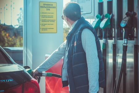 Man fills up his car with a gasoline at gas station. Petrol station pump. To fill car with fuel. Gasoline and oil products.