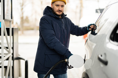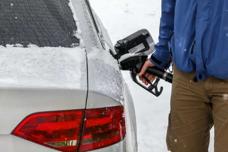 Man filling fuel to his diesel car at gas station in winter. Detail on snow covered tank cover and pump nozzle.