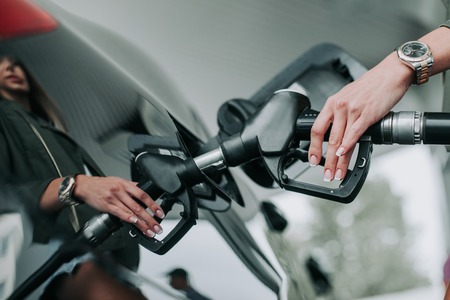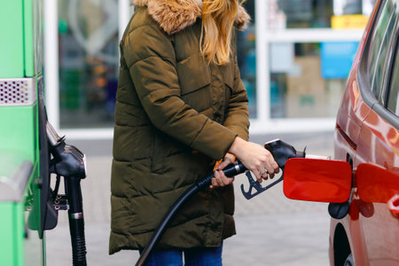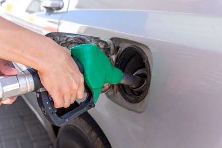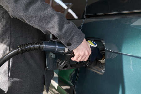 Pumping gas fuel car at oil station. Woman hand refuel petrol nozzle tank. Refueling transportation and Automotive industry.