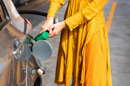 Pumping gas fuel car at oil station. Woman hand refuel petrol nozzle tank. Refueling transportation and Automotive industry