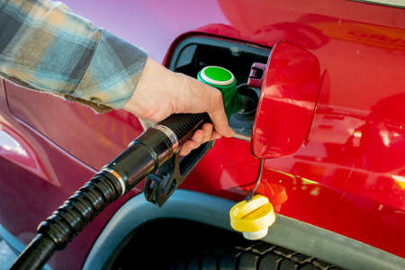 Pumping petrol at gas station into vehicle. Hand holding a red pistol to refuel car with gasoline.