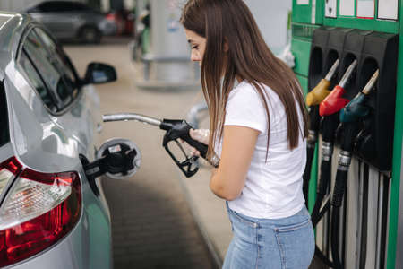 Attractive young woman refueling car at gas station. Female filling diesel at gasoline fuel in car using a fuel nozzle. Petrol concept. Side view