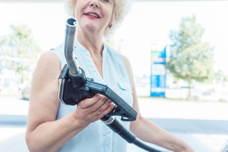 Close-up of the hand of a senior female driver holding the gas dispenser before filling the tank of her car at the station