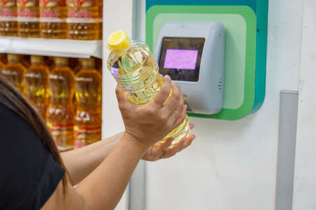 Close up of fuel monitoring system refueling a petroleum to vehicle at gas station.