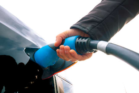 Man holding an attached charger on the Electric Vehicle in focus. High quality photo. Charging EV car. Carbon free. Future technology. Zero emmision electric car. Fast AC 42w EV charger.