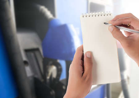 Hand hold blank notepad with space for text,Blur fuel dispenser background